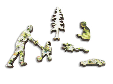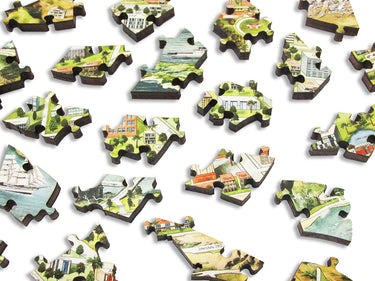 This puzzle designed by Jef Bambas and whimsy pieces designed by Kathryn Flocken represent many of the city's history and features, from famous residents to the famous tiny murals painted on the local store walls. This puzzle has a straight edge and an average difficulty rating. Like all our puzzles, laser-cut from 1/4" thick wood. Packaged in our standard pine wood box. Made in USA.