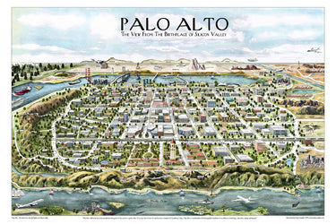 This is a 418 piece puzzle of Kirby Scudder's imaginative map of Palo Alto, California. Located in the heart of Silicon Valley (and right next to where we make these puzzles), Palo Alto is a city of innovation. The map is in the New Yorker style, where main part is shown accurately but then jumps to far away locations. The map is focused on the Silicon Valley businesses (circa 2014 or so).