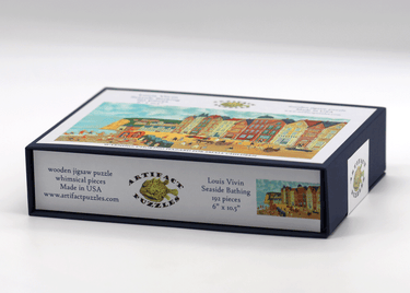 A 192 piece wooden jigsaw puzzle of a quaint seaside scene, featuring the cars, bathing suits, and buildings of the late 19th century, by French folk artist Louis Vivin.