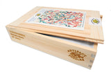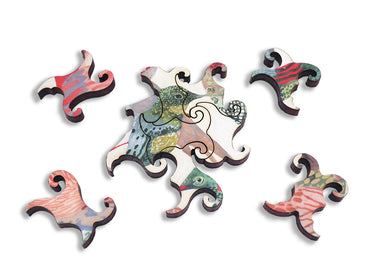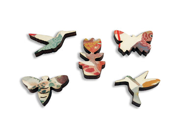 This is a 287 piece wooden jigsaw puzzle of "Hummingbirds" by Michelle Morin. The charm of hummingbirds in the art are matched, in a puzzle design by Jef Bambas, with split tendril connectors and lively whimsies. The split tendril connectors and diverse coloration make this puzzle really hard for its size. Like all our puzzles, made with 1/4" thick wood and the pieces are laser-cut. Packaged in our standard pine wood box. Made in USA.