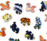 An average difficulty puzzle with themed whimsies, curvy-irregular pieces with earlet connectors, and a straight edge. Puzzle design by Marcelle Jay Iremedio.