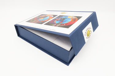 Like all our puzzles, laser-cut from 1/4" thick wood. Packaged in a small blue box with a magnetic clasp. Made in USA.