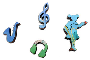 This average hard puzzle has many music-themed whimsies, a whimsical irregular edge that is positively forte., and diverse piece shapes with curly and knob connectors. Puzzle design by Tara Flannery.