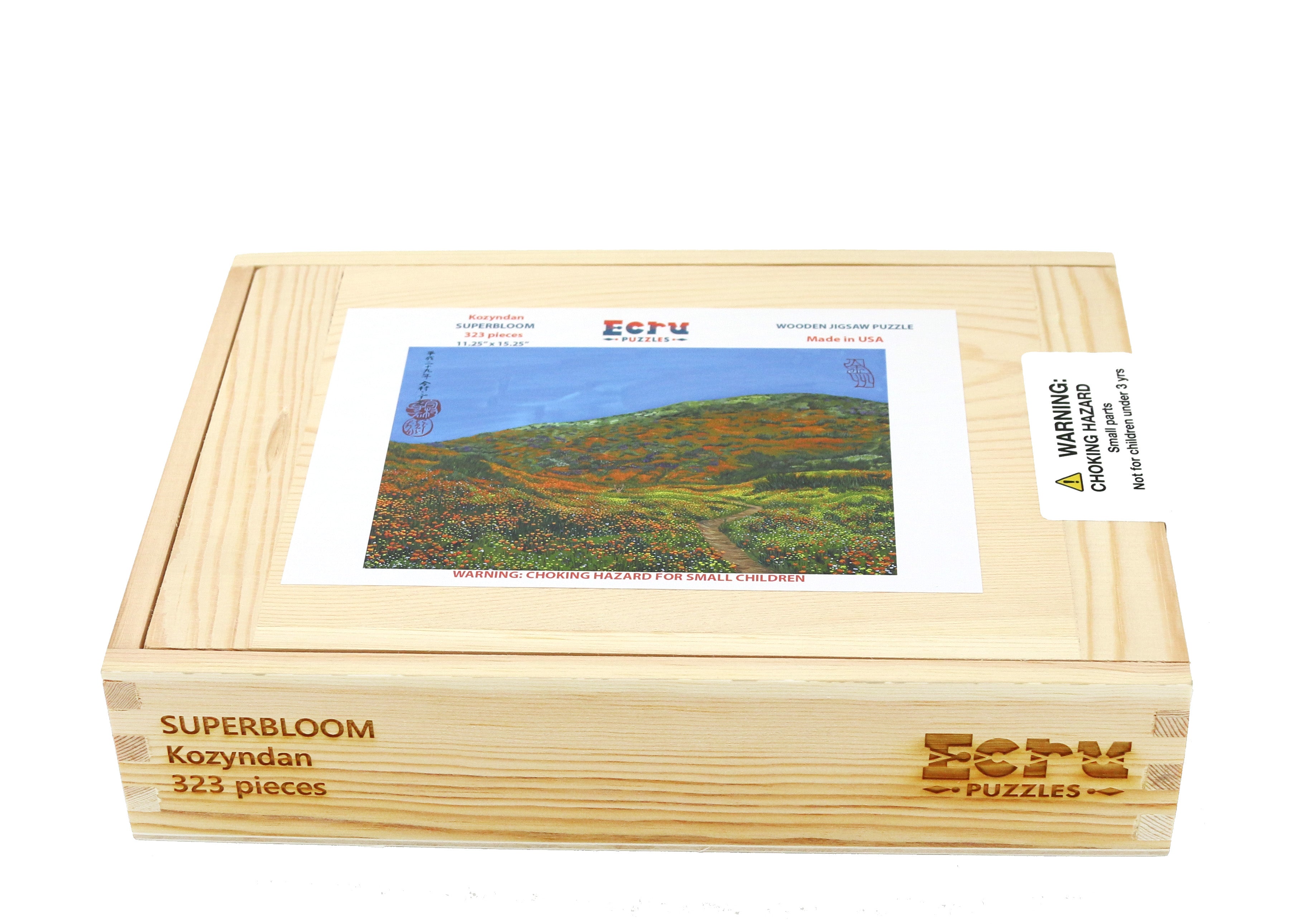 This beautiful 323 piece wooden jigsaw puzzle of a Californa hillside super-blooming with poppies by the artist couple known as Kozyndan.