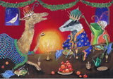In British painter E.C Woodard's signature style, the fun for all-ages artwork shows the three kings that visited Jesus bearing gifts, depicted as animals celebrating with a feast.