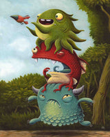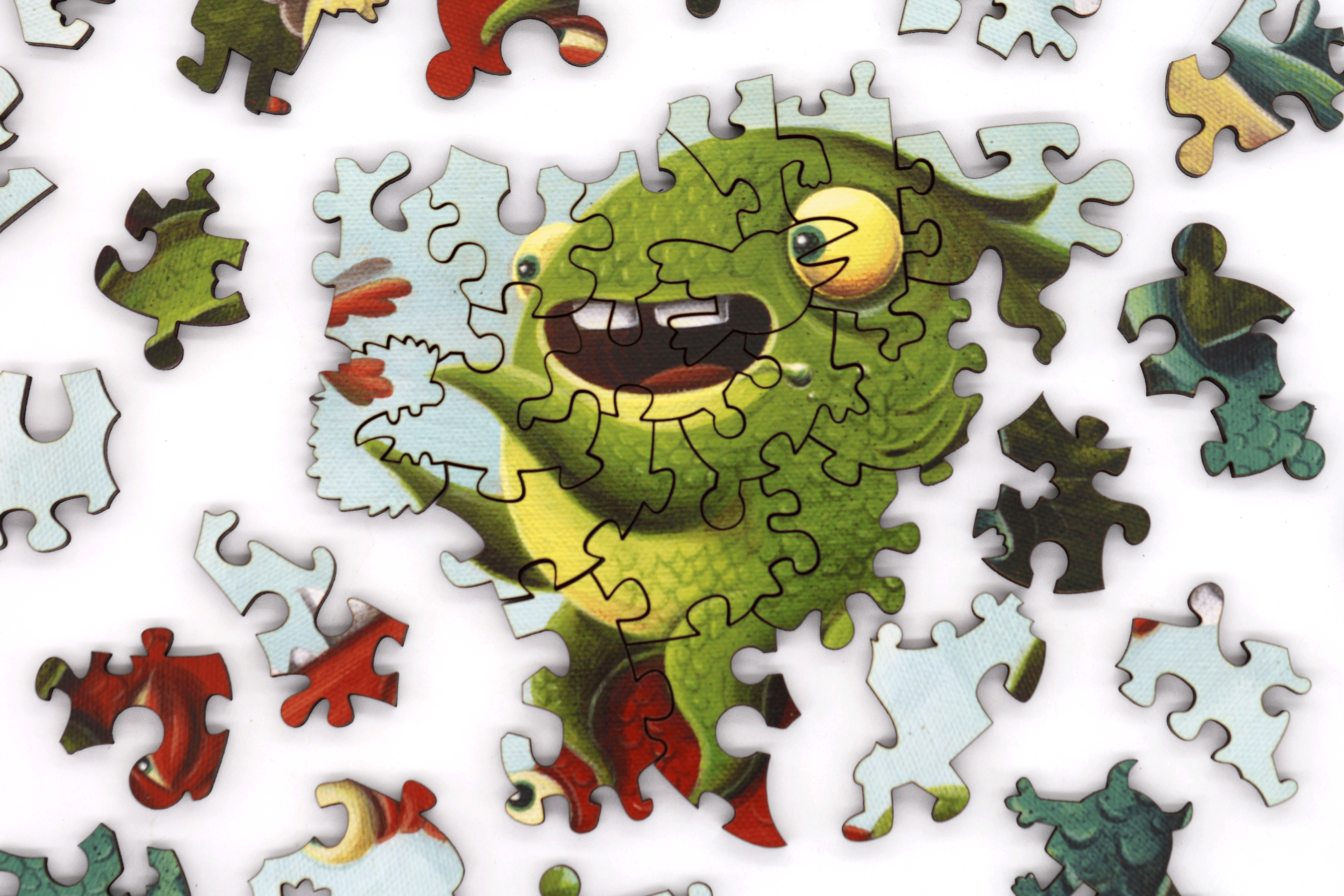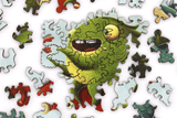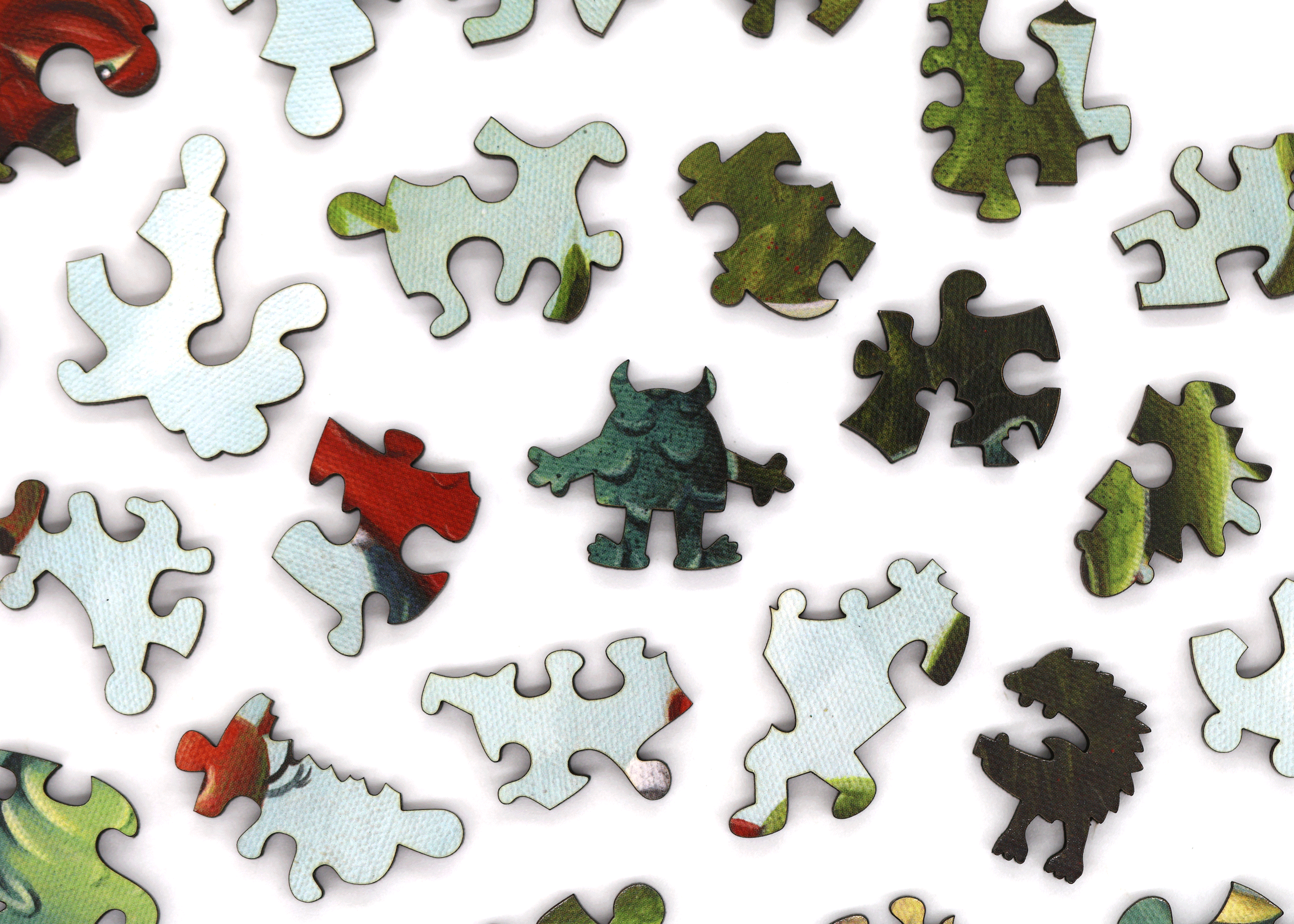 This is a 185 piece wooden jigsaw puzzle of Seattle artist Justin Hillgrove's painting "Pursuit of Happiness." The puzzle has irregular piece shapes, cheery-monster whimsy pieces, a straight edge and is easier than average.