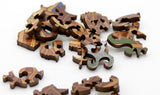 The puzzle pieces are laser-cut and are 1/4" thick wood. Packaged in a pine wood box with sliding lid.